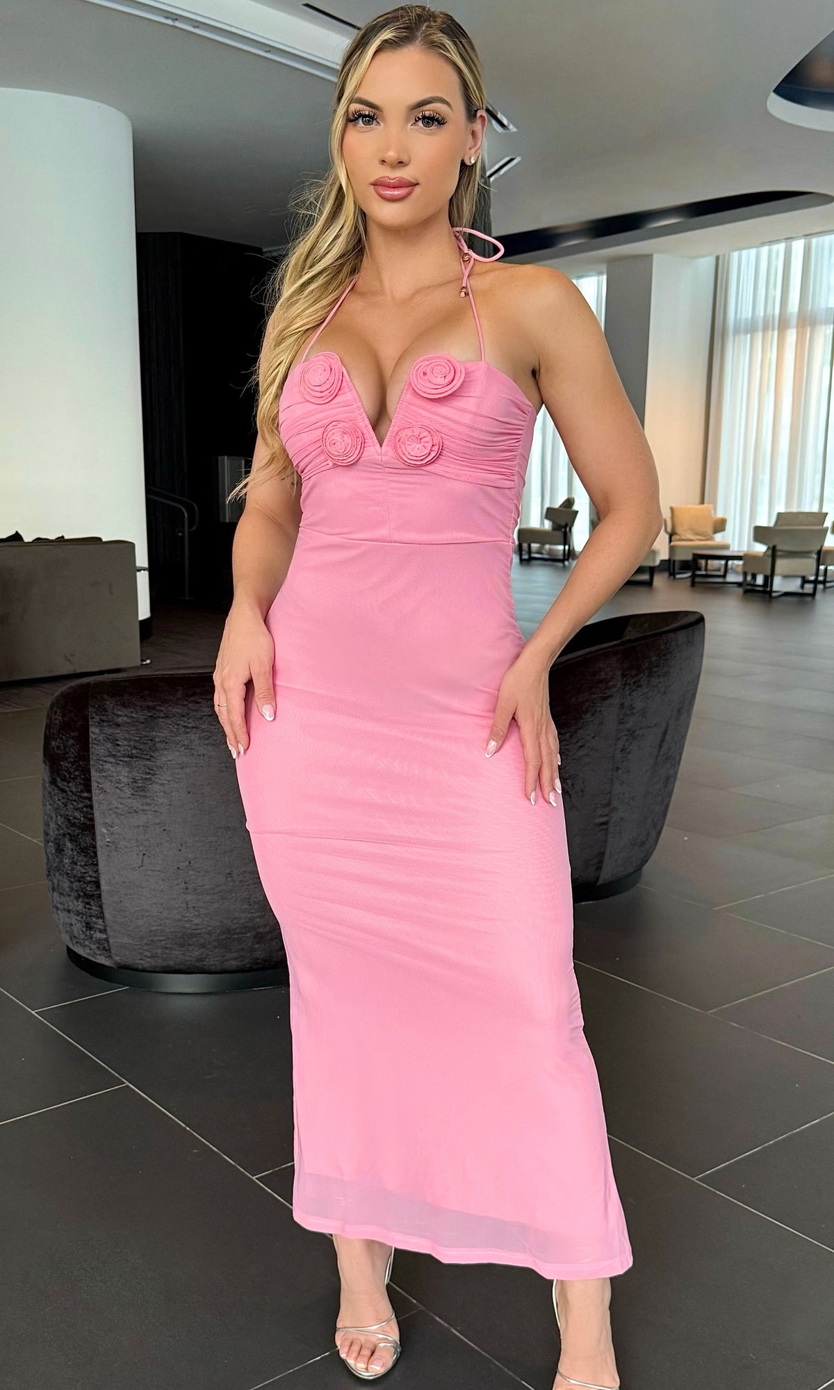 DIANA HALTERNECK ROSETTE MIDI DRESS